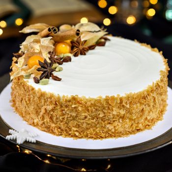 • Морковный бисквит: Сочный морковный пряный бисквит с ноткой корицы и ароматом апельсина. Бисквит пропитан сиропом на основе апельсинового сока, он обладает нежной текстурой и приятной сладостью. В бисквит добавлены кусочки грецких орехов, они придают торту хрустящую структуру и нотки орехового вкуса.