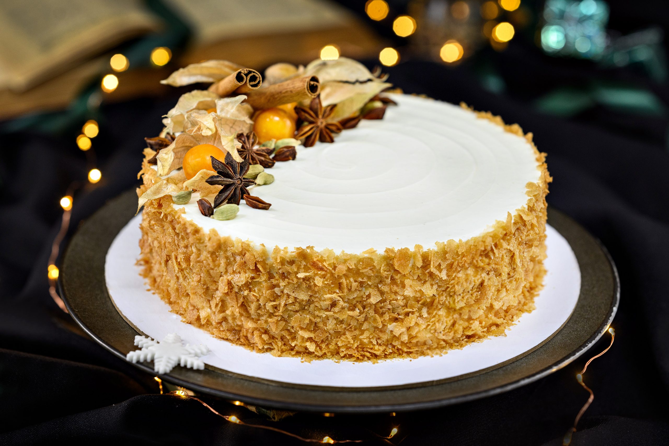 • Сливочно-сырный крем: Воздушный и нежный крем, приготовленный из качественного сливочного сыра, сыра Маскарпоне и сметаны, добавляет торту утонченный вкус и кремовую текстуру. Нежная текстура сыра Маскарпоне и легкая кислинка сметаны отлично сочетаются с пряным влажным бисквитом.